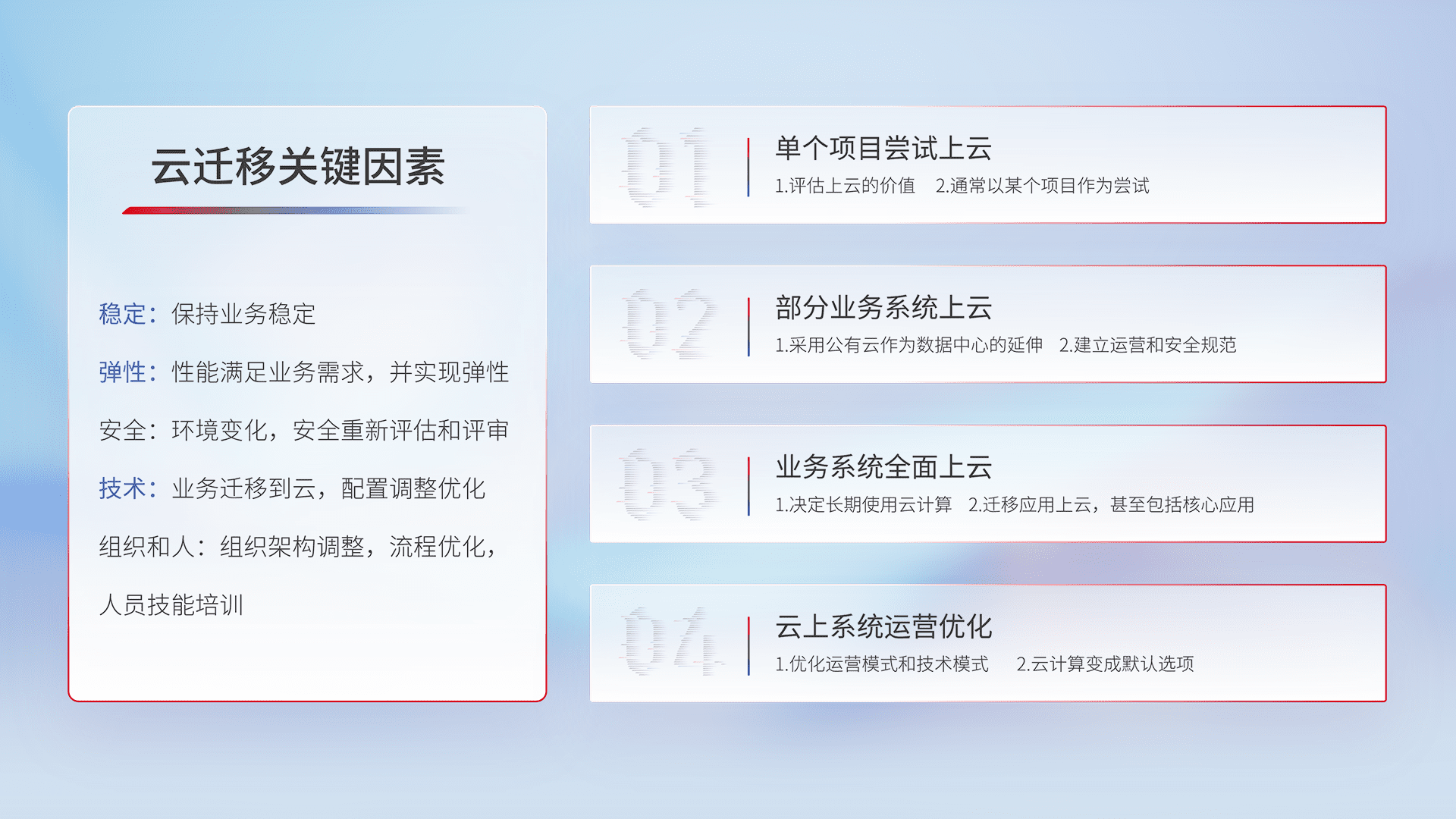 结合实际业务,,,从规划设计、、云平台选型、、、云原生改造、、、、数据迁移、、集成交付,,迁移全过程为客户识别最佳上云路径,,,,做好风险识别管理,,,设计网络架构、、身份权限、、、、安全审计合规、、、、操作审计、、、、日志审计、、、、监控告警策略、、多站点容灾设计等,,,,对云上基础设施进行整体规划,,,,提升IT治理水平,,,以满足弹性、、、、高可用、、高性能的需求。。。。