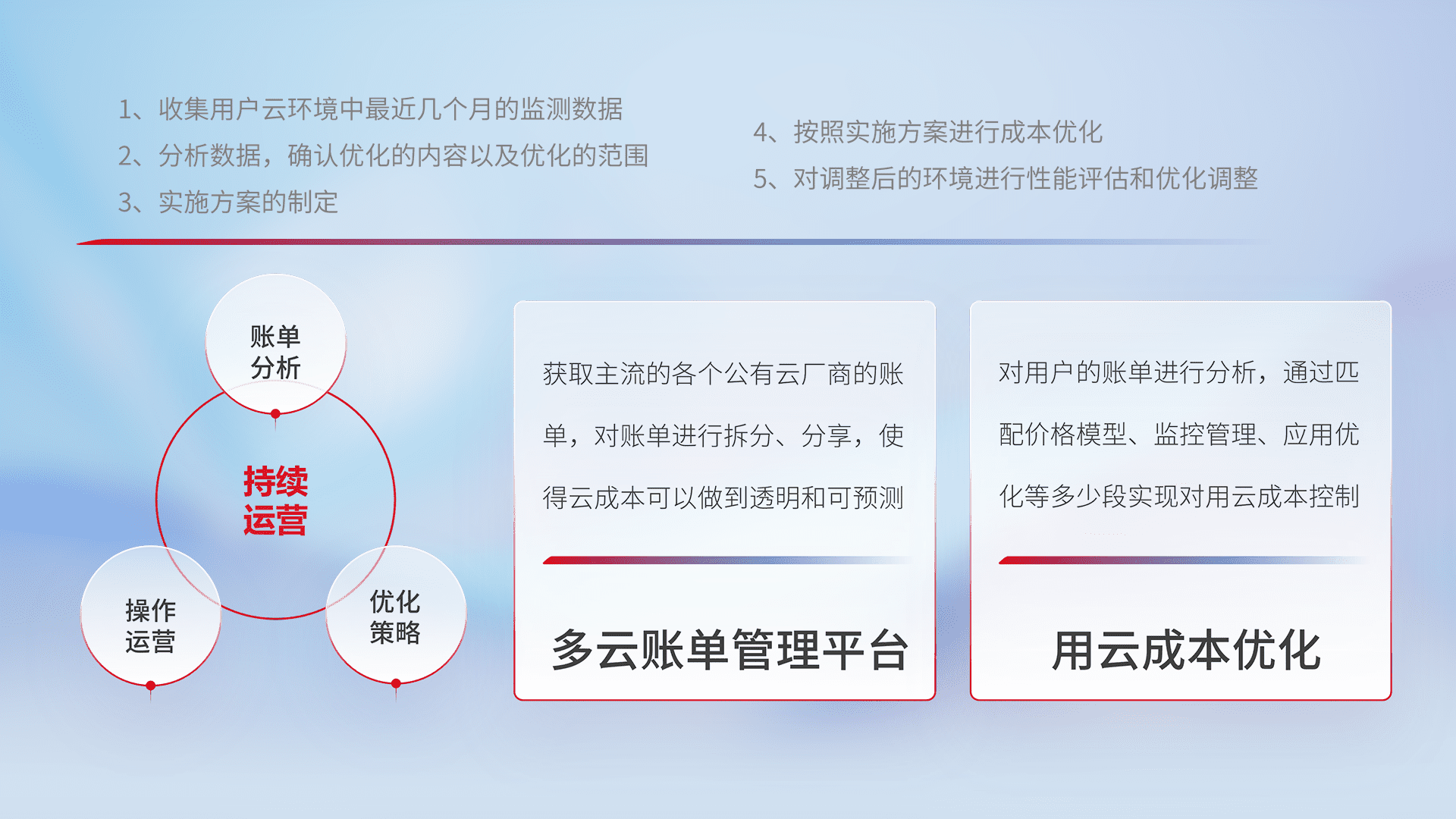 通过多云纳管,,,以统一的资源数据模型把客户的云资源进行抽象和封装,,,,进而实现对多云资源的统一操作,,,保障云资源管理的可靠性、、稳定性与可用性。。。。量身定制化运维内容,,,,配置、、开发运维、、、、补丁管理、、备份、、、、监控、、、认证和访问管理、、、审计和日常巡检等,,保障在用云过程中的可靠度,,,,稳定度以及高可用率。。。